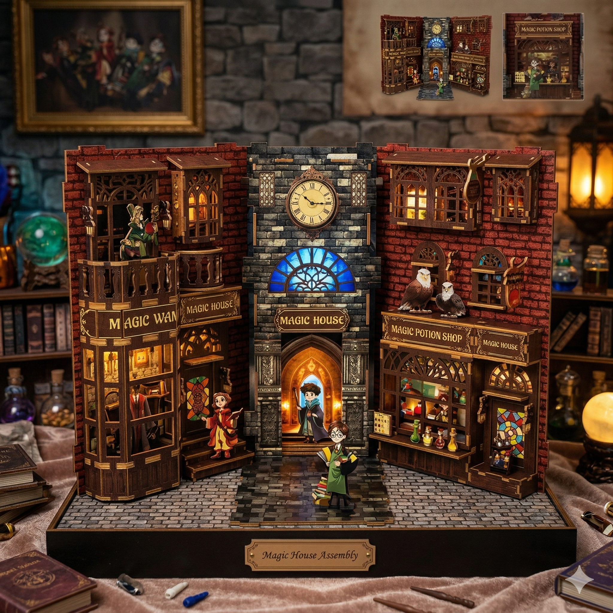 Este diseño está inspirado en ambientes tipo Harry Potter, con detalles que evocan bibliotecas antiguas, tiendas mágicas y escenas llenas de fantasía.