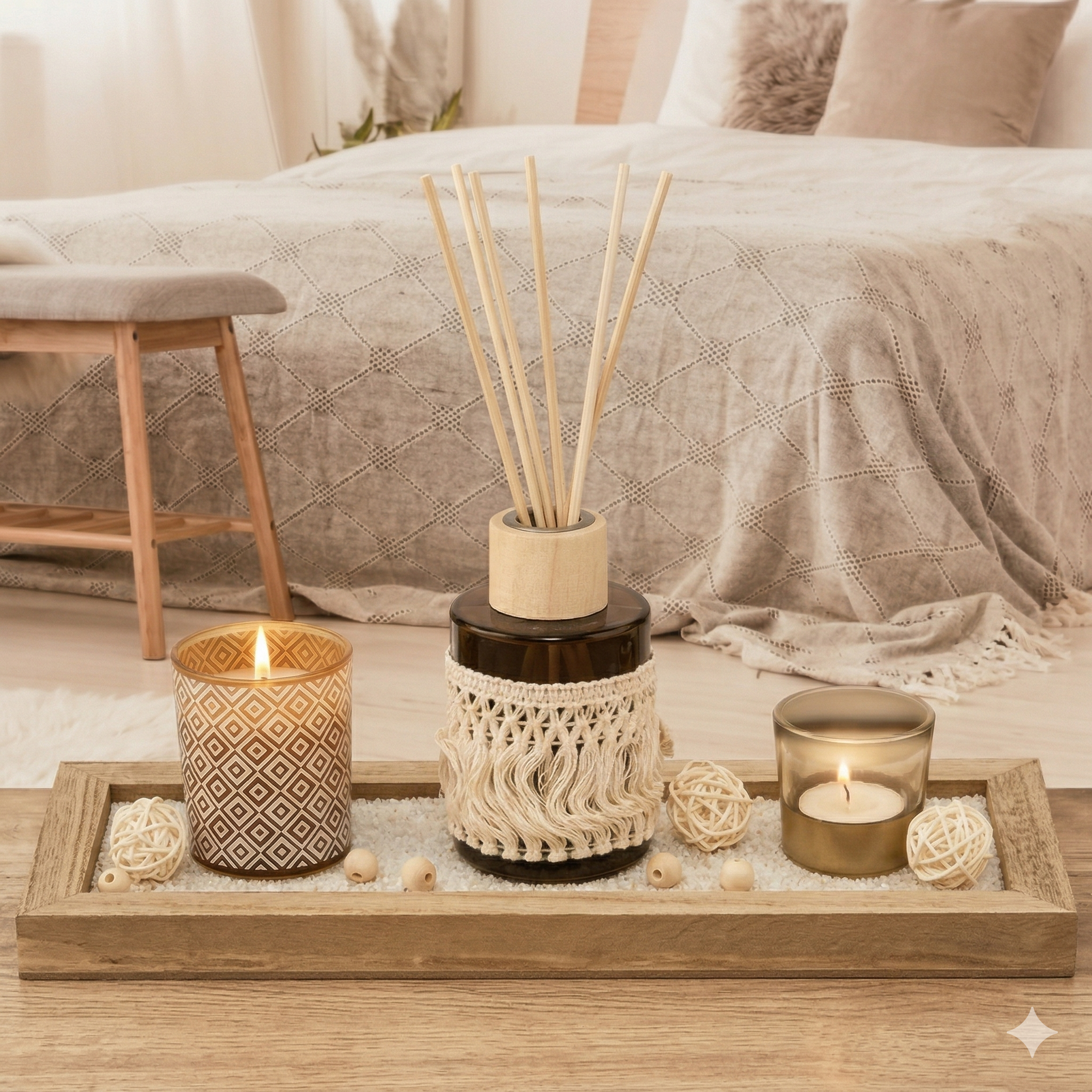 Este set combina perfectamente con salas, dormitorios o baños. Su diseño con bandeja de madera y detalles decorativos crea una estética acogedora y sofisticada.